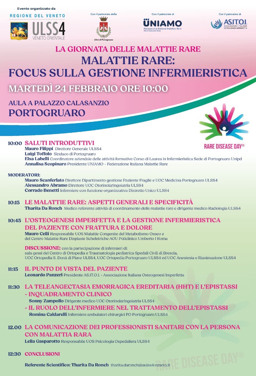 PORTOGRUARO – Un confronto dedicato alla presa in carico dei pazienti con malattie rare, con particolare attenzione al ruolo dell’infermiere nel percorso assistenziale. In occasione della Giornata mondiale delle malattie rare, l’Ulss4 promuove il meeting “Malattie rare: focus sulla gestione infermieristica”, in programma martedì 24 febbraio a Palazzo Calasanzio.