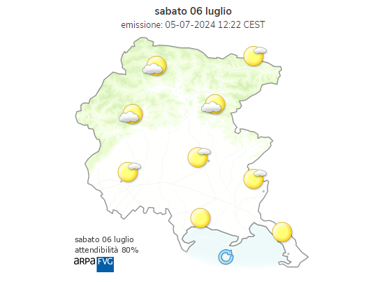 Il 6 luglio 2024 si preannuncia una giornata splendida per il Nordest italiano, con condizioni meteorologiche favorevoli sia in Friuli Venezia Giulia che in Veneto. Le temperature estive, i cieli sereni e le numerose attività ed eventi locali renderanno questa giornata perfetta per esplorare le bellezze di queste regioni e godersi il meglio che l'estate ha da offrire.