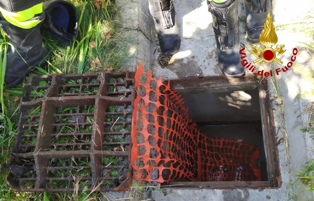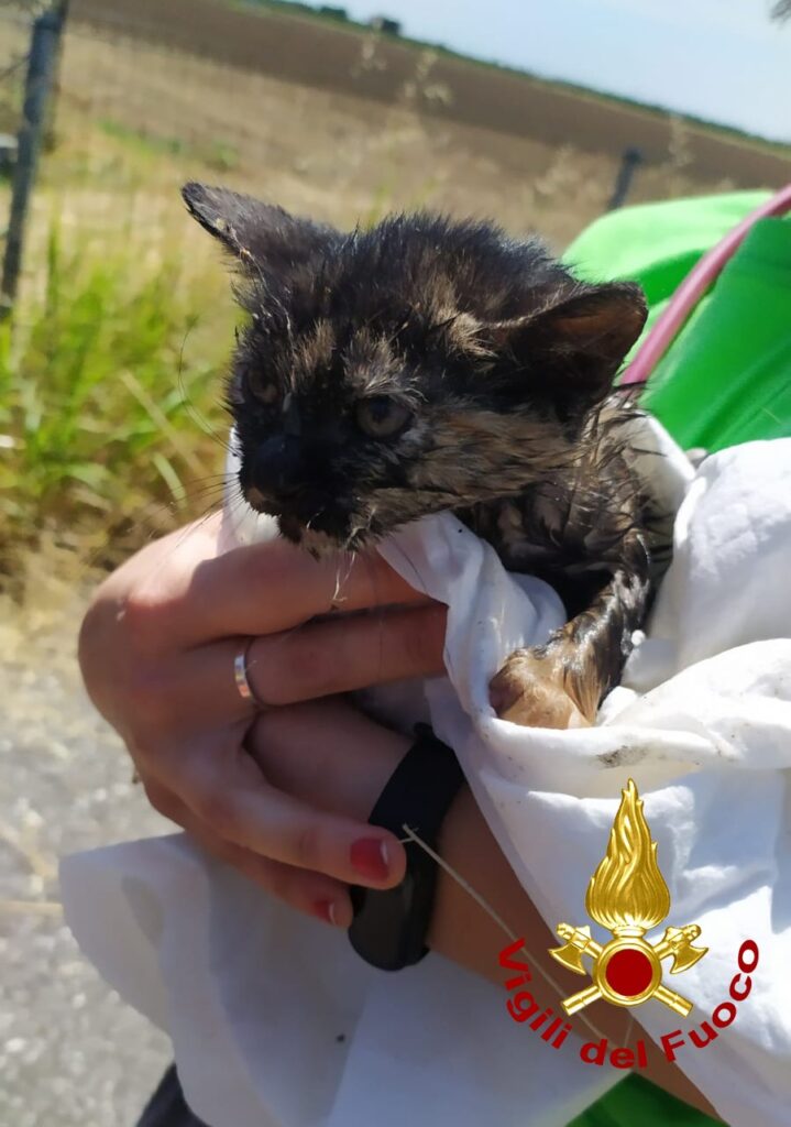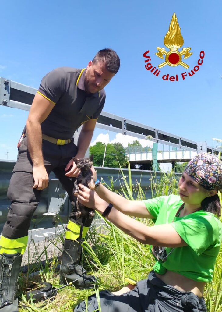 I pompieri dopo aver ascoltato il miagolio del micio provenire da sotto terra, hanno individuato uno scarico vicino l’attigua autostrada dove il gattino si era infilato.