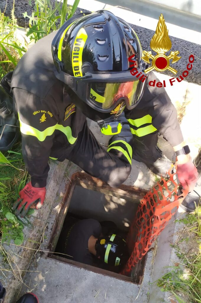 Un vigile del fuoco si è calato all'interno del pozzetto riuscendo a individuare il piccolo felino molto diffidente, che è stato poi recuperato con alcuni stratagemmi.