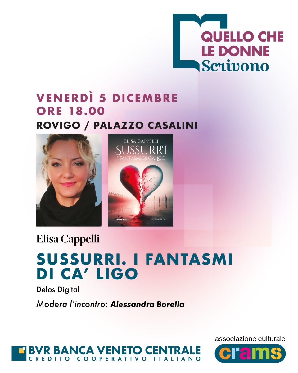Venerdì 5 dicembre, alle ore 21 (o secondo l’orario definito dagli organizzatori), il Salone d’Onore di Palazzo Casalini ospiterà la presentazione del romanzo “Sussurri. I fantasmi di Ca’ Ligo” di Elisa Cappelli, che dialogherà con la giornalista Alessandra Borella davanti al pubblico rodigino.
