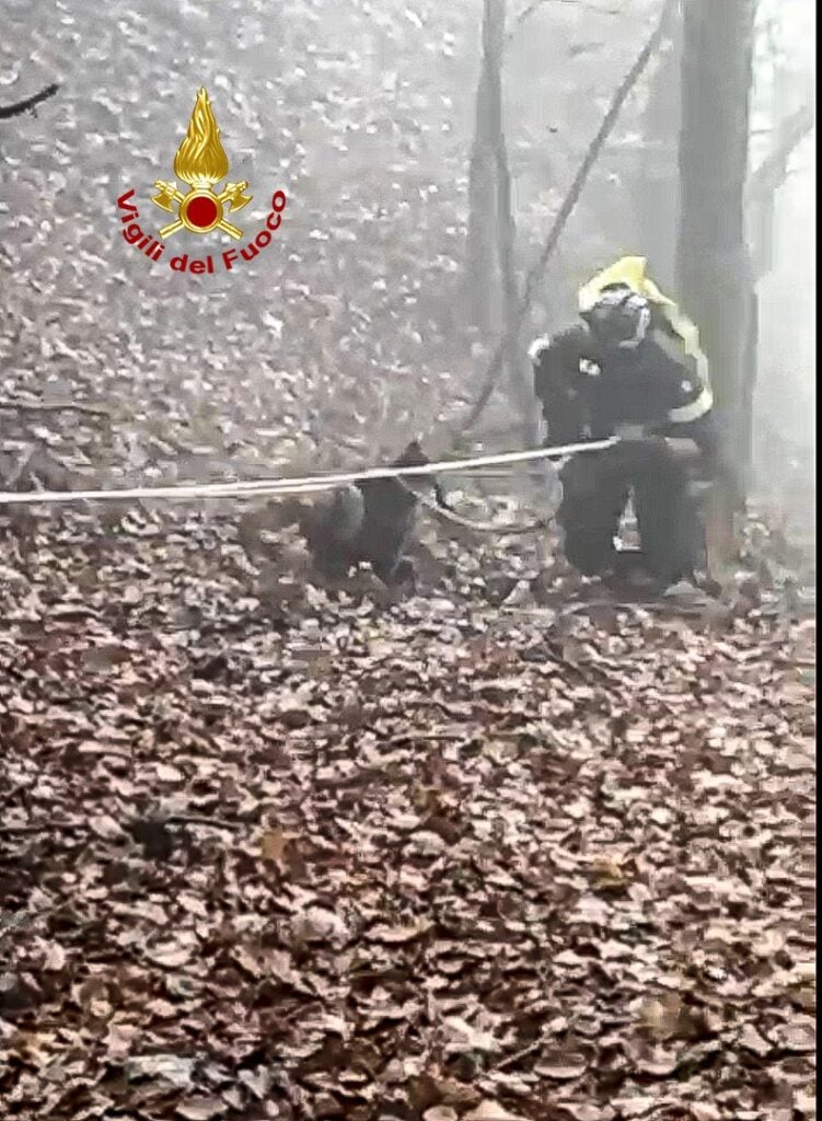 Un operatore SAF (Speleo Alpino Fluviale) è stato calato nel dirupo per raggiungere Lampo, che si trovava in una situazione precaria, incapace di risalire a causa della pendenza vertiginosa in alcuni tratti. Con grande professionalità e abilità, l’operatore ha assicurato il cane e, insieme, sono stati portati in sicurezza verso l’alto.