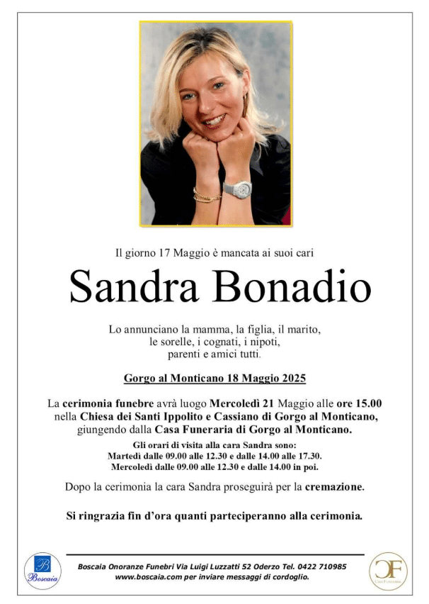 Gorgo al Monticano piange Sandra Bonadio, scomparsa a 54 anni. I funerali si terranno mercoledì 21 maggio.