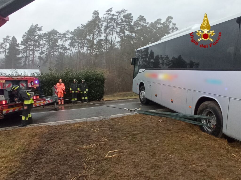 I pompieri accorsi da Belluno e con i volontari dell’Alpago con tre automezzi, tra cui l’autogrù, hanno imbragato e rimesso in strada la corriera.