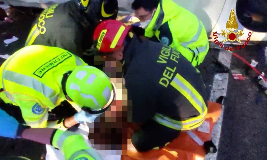 Un vigile del fuoco è riuscito ad entrare nell’abitacolo dalla parte opposta e dopo i primi soccorsi sanitari, ha liberato una gamba incastrata sotto la pedaliera.