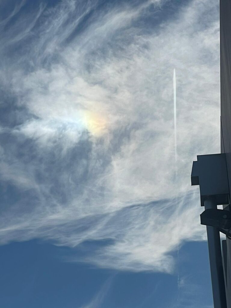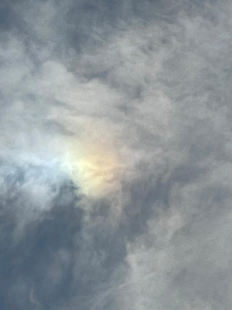 Le nuvole "colorate", note come nuvole iridescenti, sono un fenomeno atmosferico in cui le nuvole appaiono con sfumature di colori brillanti. Questo effetto si verifica quando la luce solare viene diffusa da piccole particelle di acqua o cristalli di ghiaccio presenti nelle nuvole, separando la luce nei vari colori dello spettro visibile. Le condizioni ideali per l'osservazione includono nuvole sottili e un angolo di luce solare basso, tipico dell'alba o del tramonto. Oggi, in modo insolito, sono state fotografate dopo le ore 10 del mattino.
