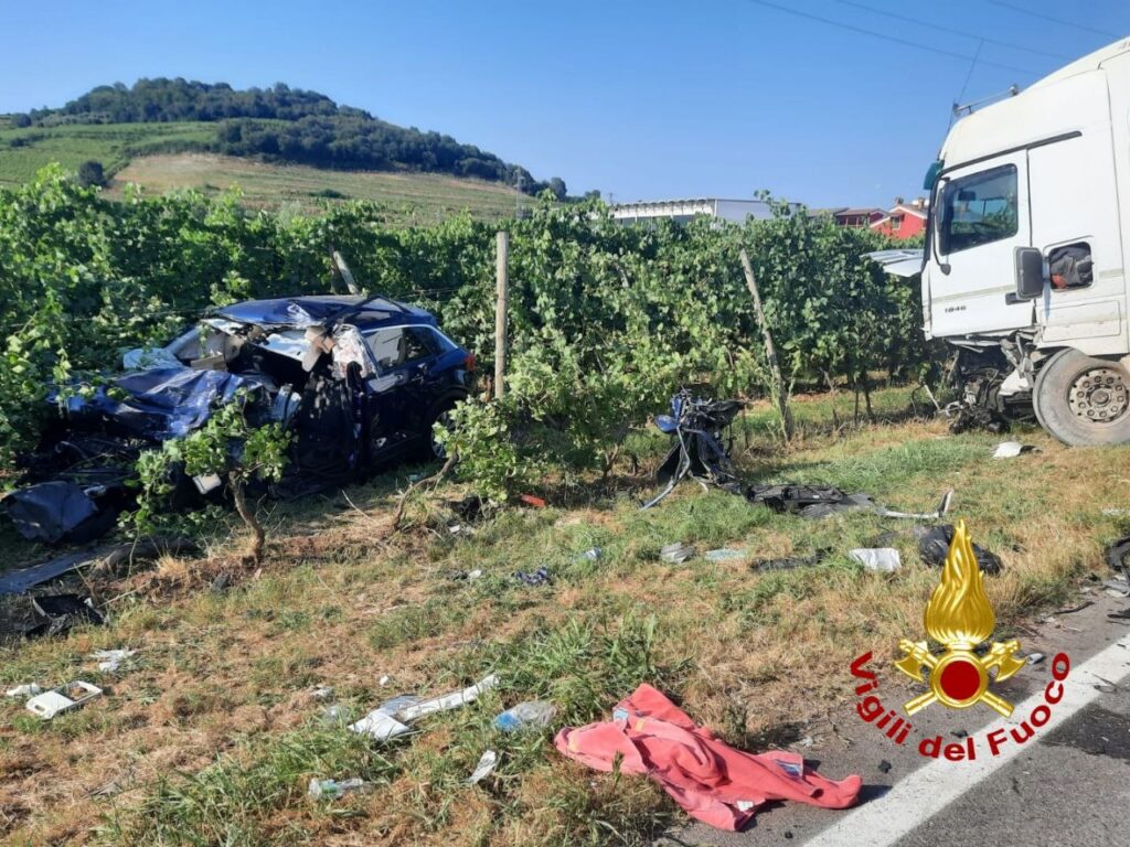 Incastrato tra le lamiere l'autista della vettura, feriti i due passeggeri di cui uno sbalzato fuori dal mezzo, illeso l'autista del bilico, strada completamente chiusa al traffico.