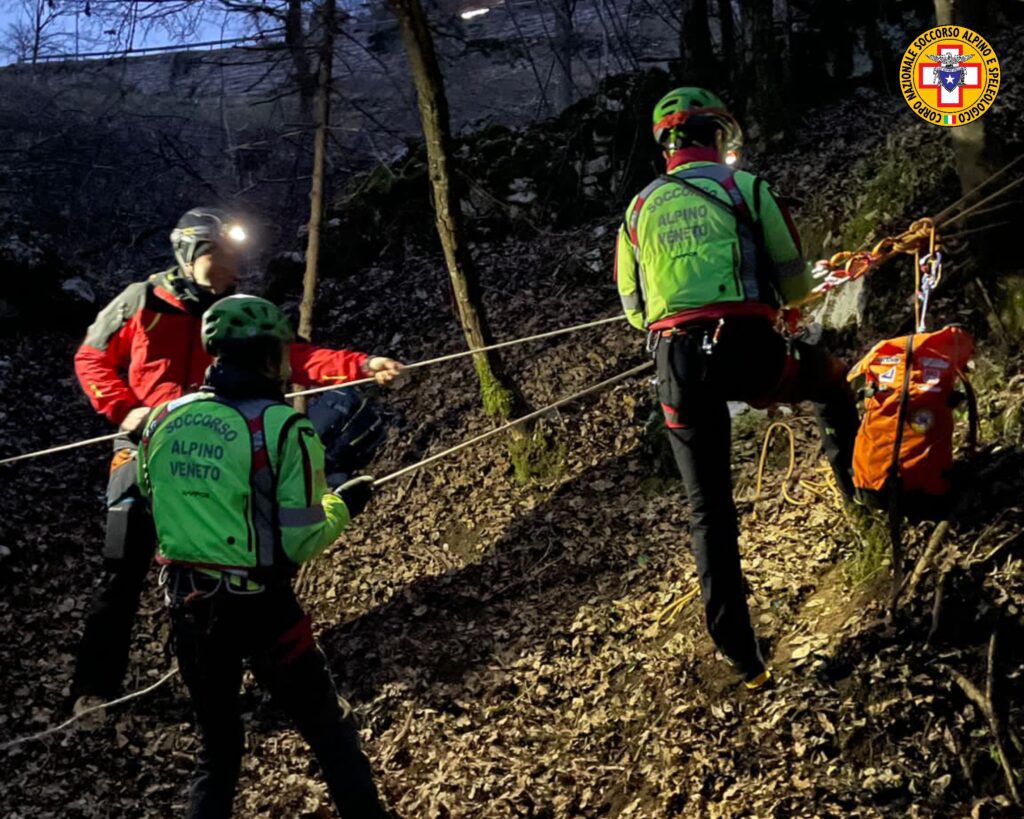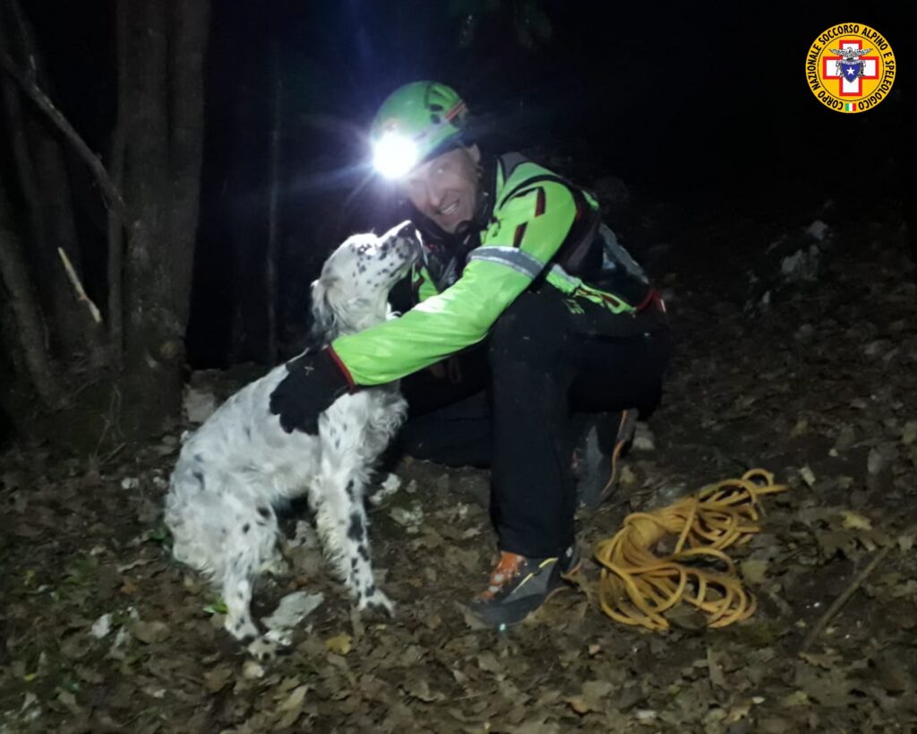 Due squadre di Asiago e della Pedemontana del Grappa, 9 tecnici in totale, hanno raggiunto il punto in cui il cane aveva iniziato la discesa e hanno attrezzato la calata di 160 metri.