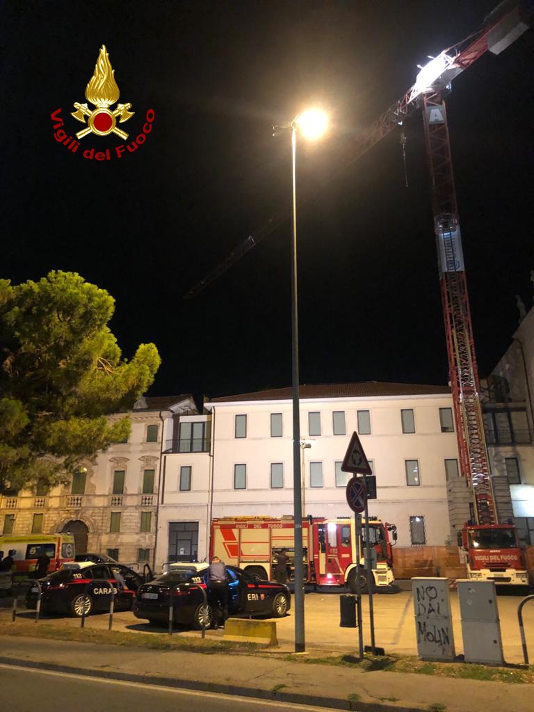 La notte scorsa poco dopo la mezzanotte, i vigili del fuoco sono intervenuti, in centro storico, in Piazza Matteotti a Vicenza per soccorrere un giovane salito sul braccio laterale della gru edile a c...
