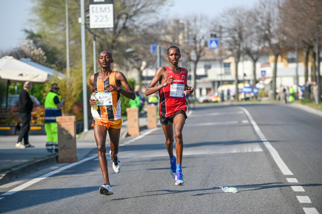 L’avvio della gara vede subito, al maschile, Njeri e Karbolo prendere la testa della corsa. I due keniani procedono con un buon passo acquistando via via un vantaggio importante sul gruppo. Al 22° km Karbolo attacca e tenta di liberarsi del compagno di “viaggio”. Njeri non risponde, perde qualche decina di metri, ma è sempre lì. Karbolo passa al ristoro del 25° ma non prende da bere. Piano piano Njeri ritorna sotto al Masai e lo raggiunge tra il 29° e il 30° km. Poco dopo parte quella che diventerà la cavalcata vittoriosa: Njeri allunga e Karbolo cede. Il 34enne arriva da solo in Prato Fiera e vince la Treviso Marathon in 2h15’37’’. Dietro Karbolo arranca e chiude in 2h22’12’’. Bella prova per Edgardo Confessa (Team Km Sport) che segna il personale con il crono di 2h29’17’’.