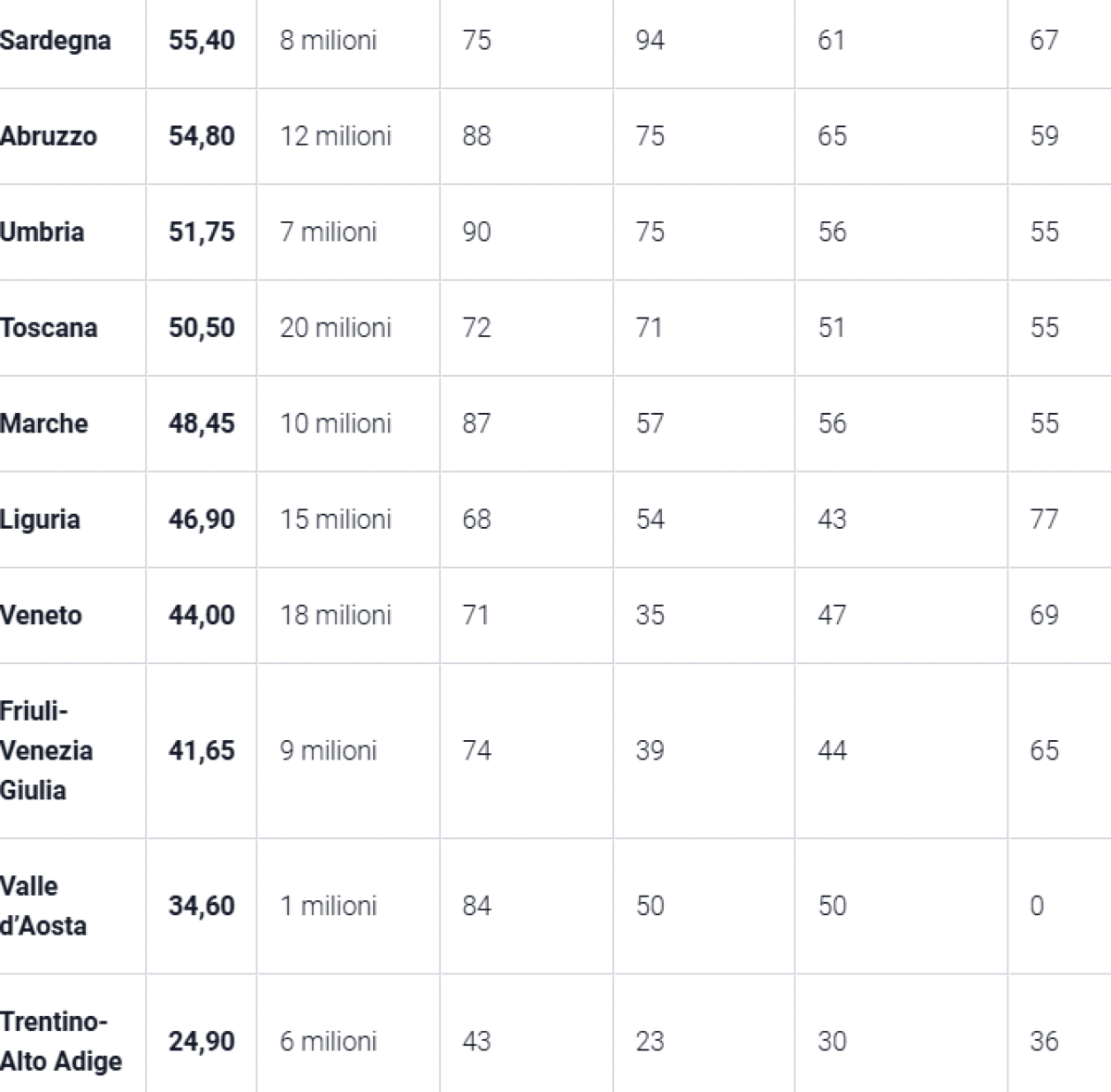 Il Veneto occupa il diciassettesimo posto con un punteggio di 44 su 100.