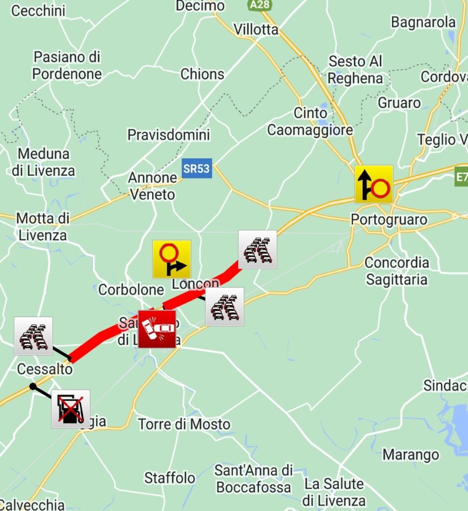 Nel sinistro sono rimasti coinvolti 5 mezzi pesanti. Chiuso anche l'allacciamento A28/A4 in direzione Venezia. Nell'impatto uno degli autoarticolati ha sbattuto contro la barriera di sicurezza centrale. A causa dell'urto la barriera è terminata nella corsia di sorpasso della carreggiata opposta (dir.Ts).  Proprio a causa di questa ostruzione si registrano code anche nella direzione opposta da San Doná al Nodo di Portogruaro.