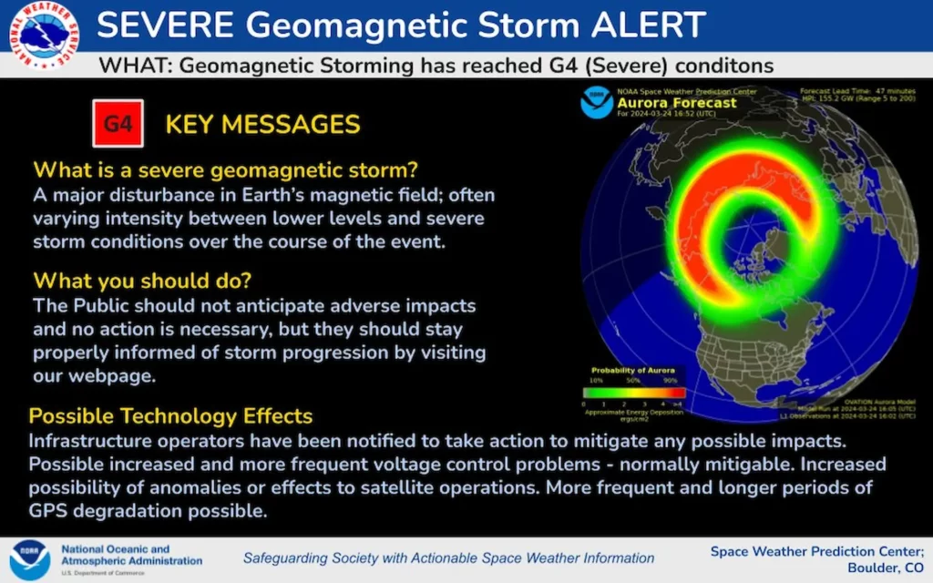 I primi a risentire degli effetti di una tempesta solare, soprattutto se di livello “estremo” o “severo” come quello registrato il 24 marzo, sono i satelliti che gestiscono i sistemi di comunicazione a distanza e satelliti per la rilevazione della posizione. In caso di tempeste gravi, con espulsione di massa coronale, c’è il rischio che subiscano danni permanenti, rendendoli inutilizzabili. Una tempesta solare di questa portata non solo porterebbe una perdita finanziaria tra i 600 e i 2.500 miliardi di dollari, ma anche caos.