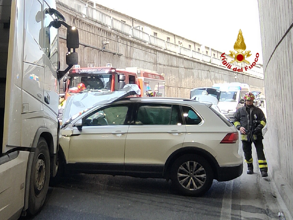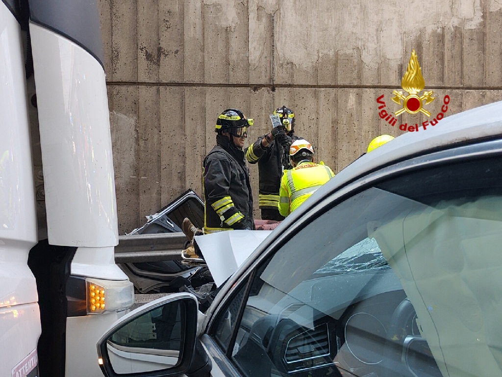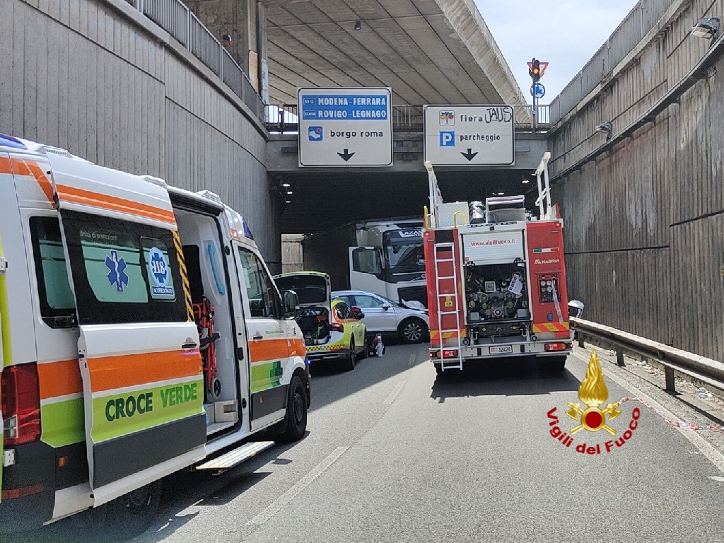 VERONA -Intorno alle 12:45 di oggi 28 aprile, una squadra di Vigili del fuoco è intervenuta in via Santa Teresa a Verona per lo scontro frontale tra un autoarticolato e due autovetture. Le auto, che scendevano nel sottopassaggio provenendo dal centro della città, improvvisamente si sono trovate di fronte il mezzo pesante che stava percorrendo contromano il tunnel e l'urto è stato inevitabile.