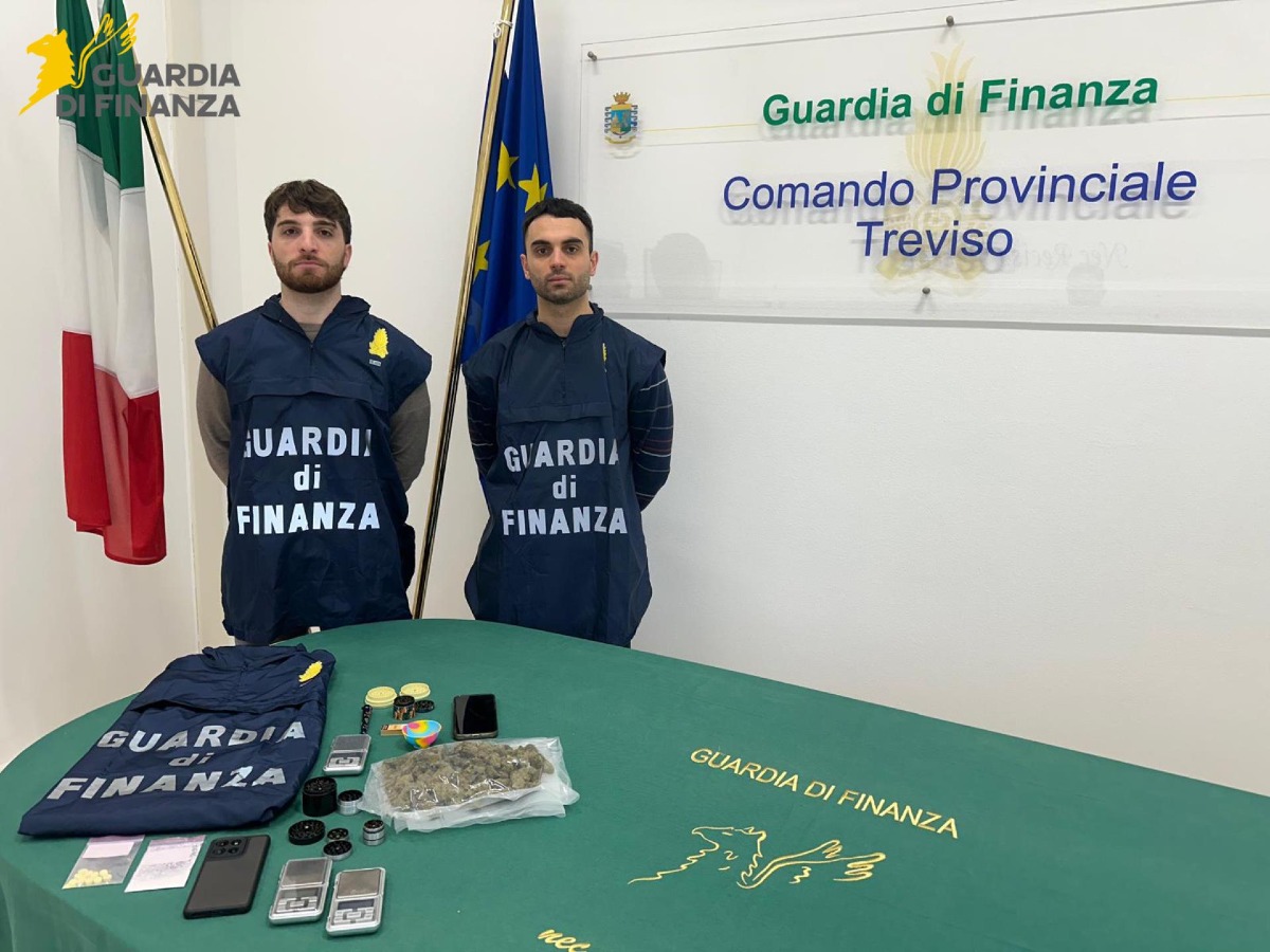 I militari del Nucleo di Polizia Economico-Finanziaria di Treviso, una volta aperto il pacco e individuata la sostanza stupefacente, hanno scortato la spedizione fino al deposito presso un locker (armadio ad apertura automatica con codice numerico o QR code utilizzato per servizi di spedizione) in forza del provvedimento di ritardato sequestro emesso dalla locale Procura della Repubblica. Dopo qualche ora di appostamento, si è avvicinato al luogo di consegna un ragazzo che, utilizzando il proprio telefono, ha aperto lo scomparto del locker dove era stata inserita la sostanza stupefacente. Le Fiamme Gialle, pertanto, sono prontamente intervenute fermando il soggetto e identificando un secondo destinatario della marijuana. Le successive attività di perquisizione personale e domiciliare, svolte nei confronti dei citati soggetti, hanno consentito di rinvenire n. 3 bilancini di precisione, n. 5 grinder (oggetto utilizzato per sminuzzare lo stupefacente), nonché numerosi pacchetti di cellophane per confezionare le dosi. La scoperta di tali ulteriori elementi pertinenti al reato ha permesso di escludere l’ipotesi del mero uso personale.