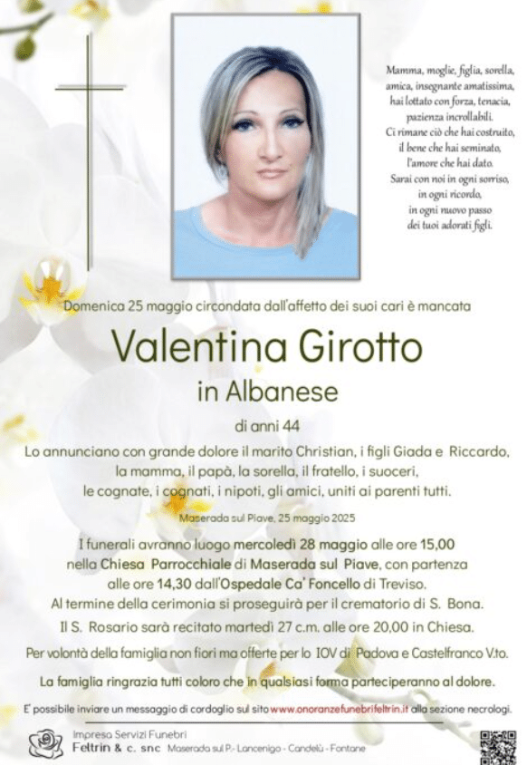 MASERADA SUL PIAVE (TREVISO) – Una comunità intera piange la scomparsa di Valentina Girotto, figura di riferimento nel mondo dell’educazione e del sociale, venuta a mancare a soli 44 anni dopo una lunga malattia. Viveva a Maserada con il marito e i due figli.