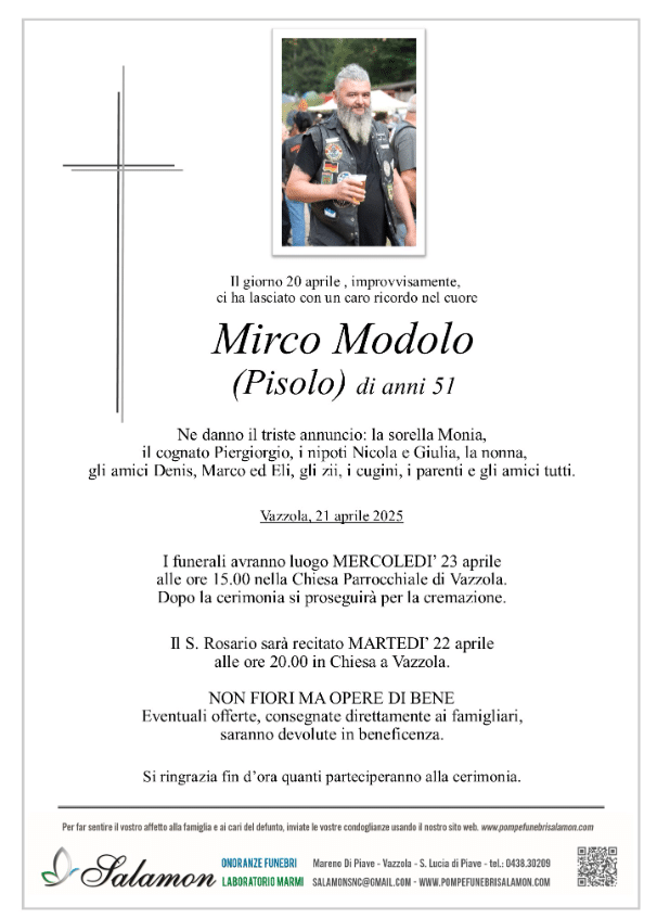 L’uomo viveva da solo e lascia una sorella, profondamente colpita dalla perdita. Questa sera, alle ore 20, sarà recitato il rosario, mentre i funerali avranno luogo domani, mercoledì 23 aprile, alle 15 nella chiesa parrocchiale del paese. La scomparsa di Mirco ha lasciato un grande vuoto in quanti lo conoscevano.