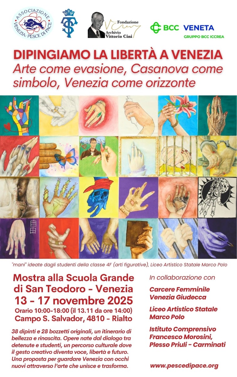 VENEZIA — Quando la libertà si può raccontare solo dopo averla perduta, il significato dell’arte cambia. E così, dal 13 al 17 novembre 2025, alla Scuola Grande di San Teodoro (orario 10-18), saranno proprio le detenute del carcere femminile della Giudecca a fare da guide alla mostra “Dipingiamo la Libertà a Venezia”, un progetto promosso dall’Associazione Venezia Pesce di Pace, guidata da Nadia De Lazzari.