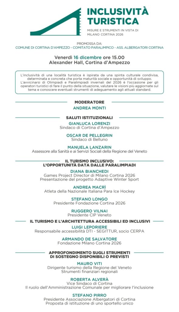 Turismo e inclusività, prospettive e soluzioni. Se ne parlerà venerdì 16 dicembre nel corso del workshop “Inclusività Turistica – misure e strumenti in vista di Milano Cortina 2026”, in programma presso l’Alexander Hall di Cortina d’Ampezzo a partire dalle ore 15. L’evento, promosso da Comune di Cortina, Associazione Albergatori di Cortina e Comitato Italiano Paralimpico, offrirà agli operatori del settore la possibilità di confrontarsi con le istituzioni su una tematica strategica e assolutamente attuale in vista dell’importantissimo appuntamento Olimpico e Paralimpico del 2026 che vedrà la “Perla delle Dolomiti” sotto i riflettori del mondo.