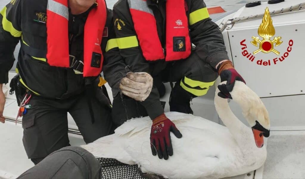 Amo da pesca e lenza conficcati nel becco: cigno ferito soccorso dai vigili del fuoco
