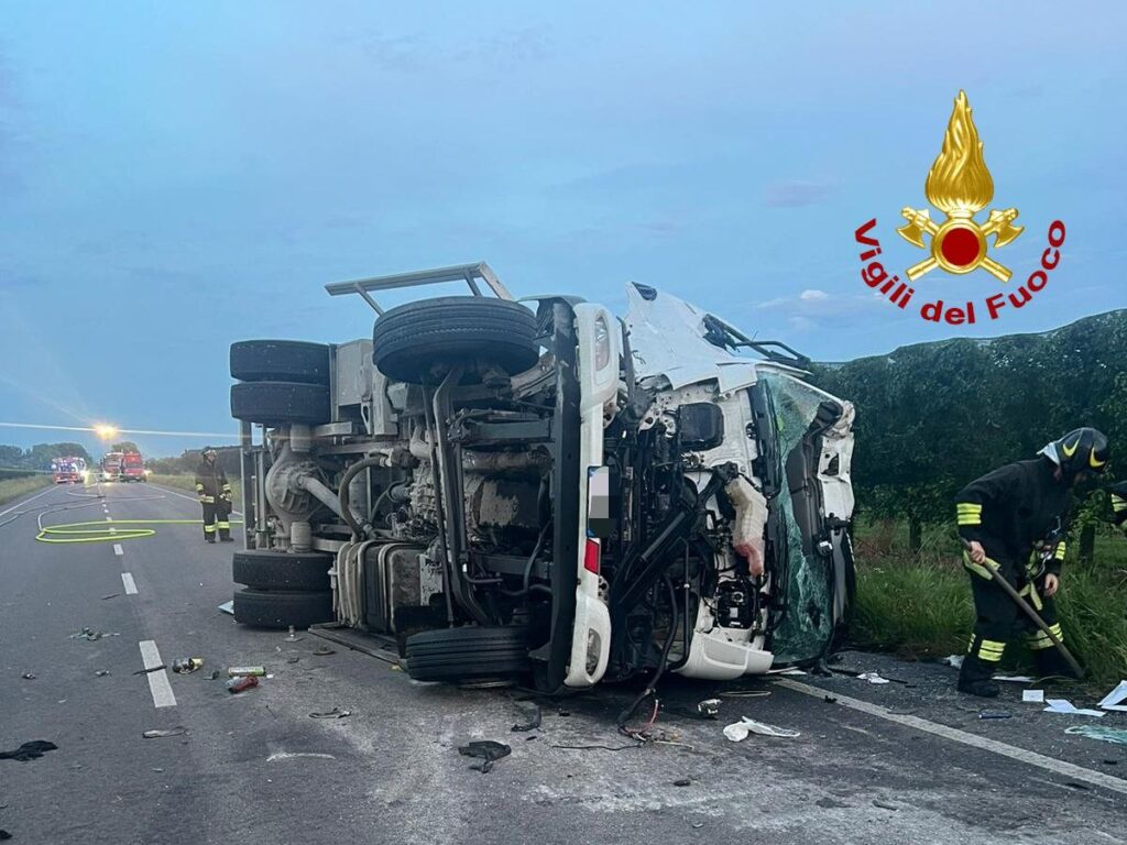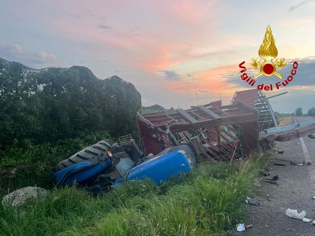 A causa dello scontro il trattore agricolo è finito fuori strada mentre il mezzo pesante si è ribaltato su un fianco.