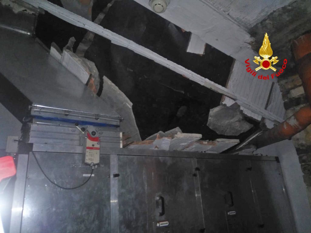 Il crollo della copertura, che ha interessato la centrale di ventilazione d’aria forzata del Duomo, è avvenuto mentre era in corso un violento temporale, l’acqua si è riversata all’interno e per percolazione è penetrata anche al piano sottostante, dove è posto un ufficio.